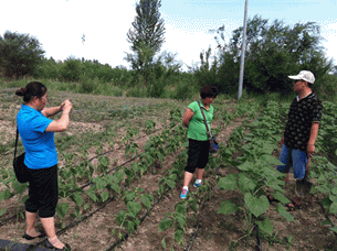福海縣高級農藝師李紅梅與公司總農藝師劉軍,科技特派員周琴在試驗地查看“吉祥雨”復合微生物菌劑產品應用效果。