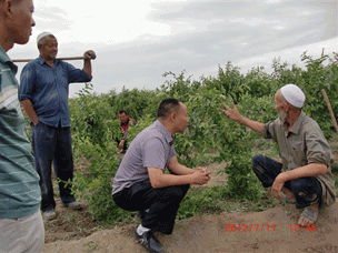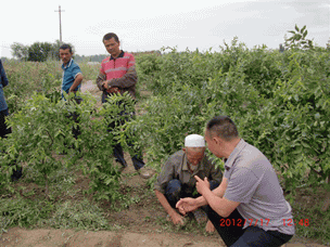 2012年7月17日,公司董事長(zhǎng)兼總經(jīng)理李智強(qiáng)到本公司產(chǎn)品土壤改良劑“施地佳”試驗(yàn)地——新疆新和縣紅棗種植基地考察并和大棗種植戶的維族老人屈膝交談。