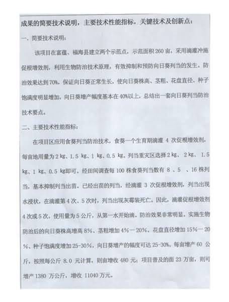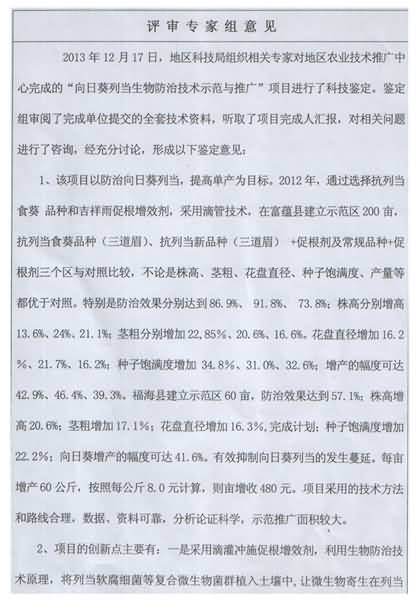 下面是新疆阿勒泰地區(qū)農(nóng)業(yè)技術推廣中心用成都華宏生態(tài)農(nóng)業(yè)科技有限公司生產(chǎn)的微生物菌肥成功攻克寄生在向日葵上的列當后,阿勒泰地區(qū)科技局對其成果的評審鑒定結果:具有先進性、創(chuàng)造性、成熟性、科學性,向日葵增產(chǎn)達到40%,其防治技術填補了阿勒泰地區(qū)空白。