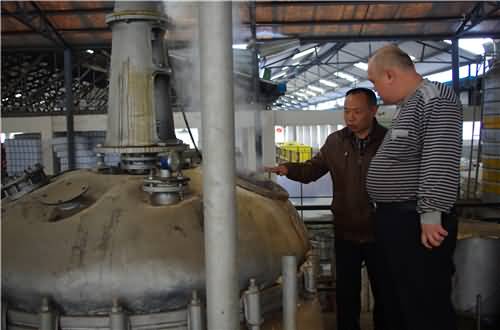 圖4:在李總的引領(lǐng)下,仝總在“施地佳”土壤改良劑生產(chǎn)車間反應(yīng)釜邊察看