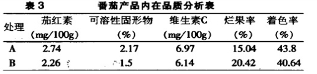 番茄品質(zhì)試驗數(shù)據(jù)表明,茄紅素含量對照比處理要低0.48mg/l00g,可溶性固形物低0.67%,維生素C含量低0.83mg/100g,爛果率高5.38%。著色率低3.16%。