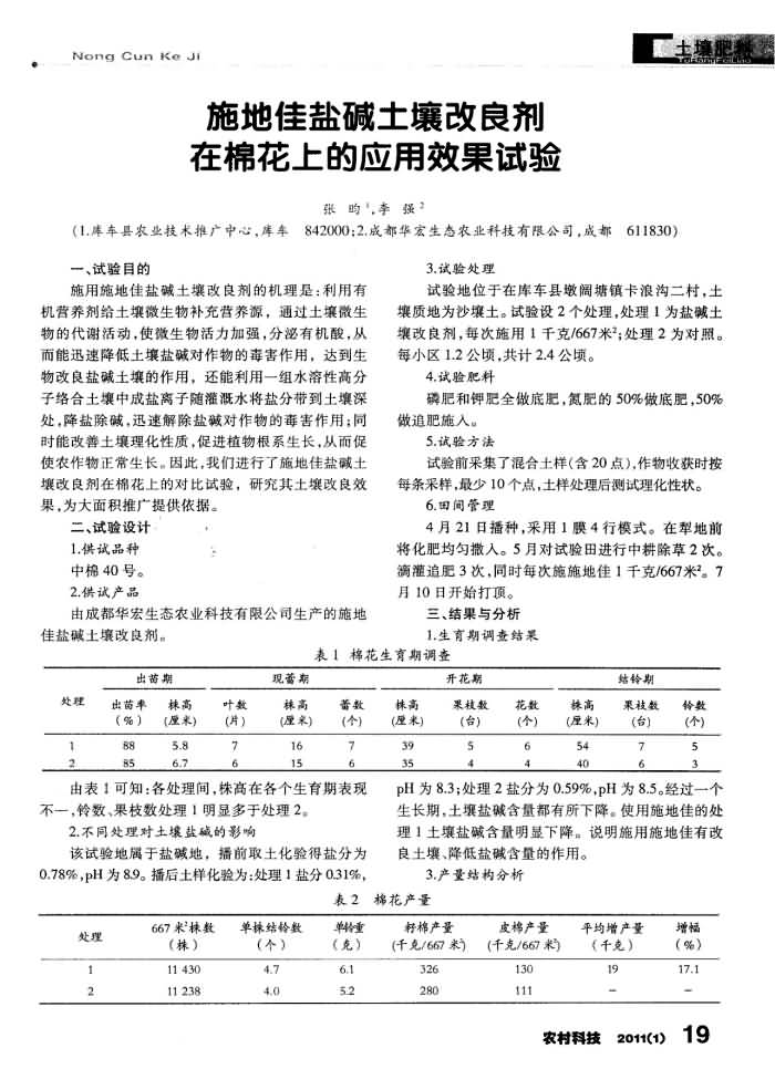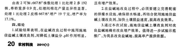 《農(nóng)村科技》2011年第1期 “施地佳”鹽堿土壤改良劑在棉花上的應(yīng)用效果試驗(yàn)