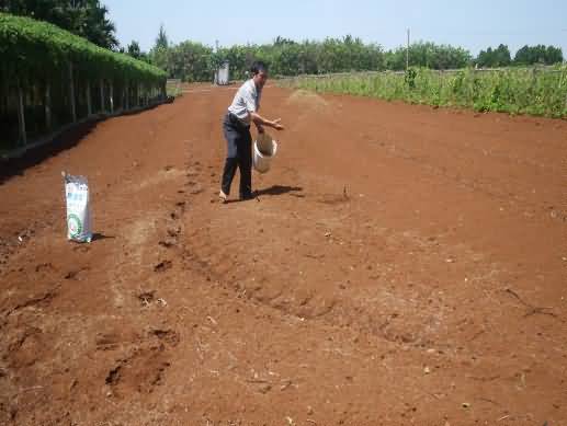圖1:試驗(yàn)果農(nóng)在撒施“施地佳”土壤調(diào)理劑 圖2:試驗(yàn)觀察員在觀察幼苗生長(zhǎng)情況