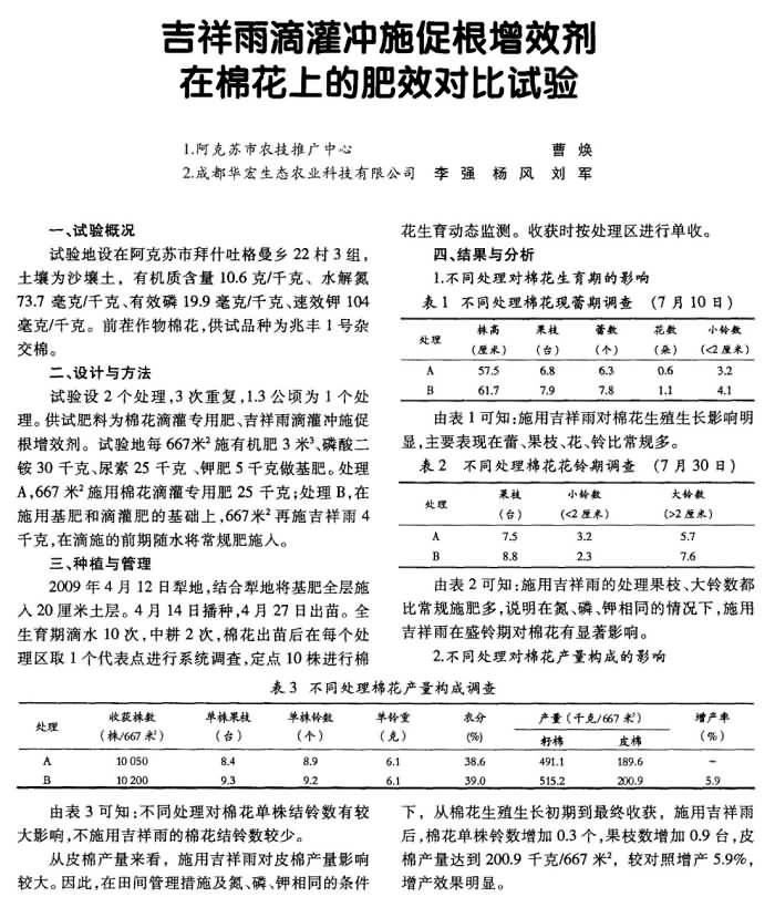 《農(nóng)村科技》2010年第8期 “吉祥雨”滴灌沖施促根增效劑在棉花上的肥效對(duì)比試驗(yàn)