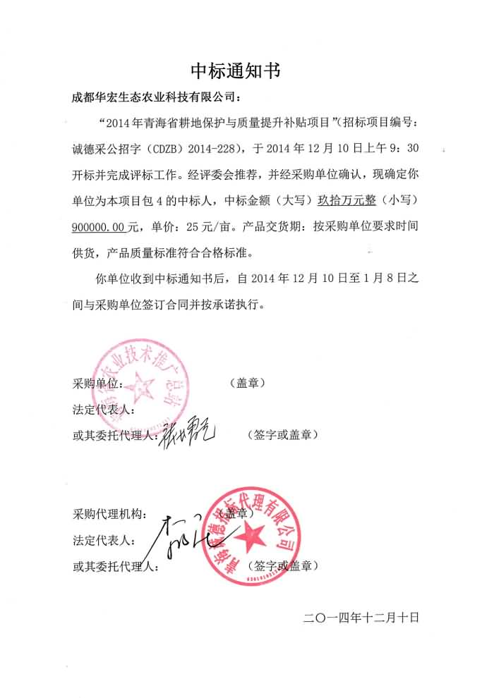 2014年12月,成都華宏生態(tài)農(nóng)業(yè)科技有限公司參加青海省農(nóng)業(yè)技術(shù)推廣總站國家耕地保護(hù)與質(zhì)量提升補(bǔ)貼項(xiàng)目招投標(biāo)競標(biāo),經(jīng)評委推薦、并經(jīng)采購單位確認(rèn)我公司為該項(xiàng)目的產(chǎn)品供應(yīng)商,這是我公司連續(xù)3年在青海省中標(biāo)該項(xiàng)目,也是我公司長期以來堅(jiān)持“質(zhì)量第一,用戶至上”的質(zhì)量和行為準(zhǔn)則的結(jié)果。