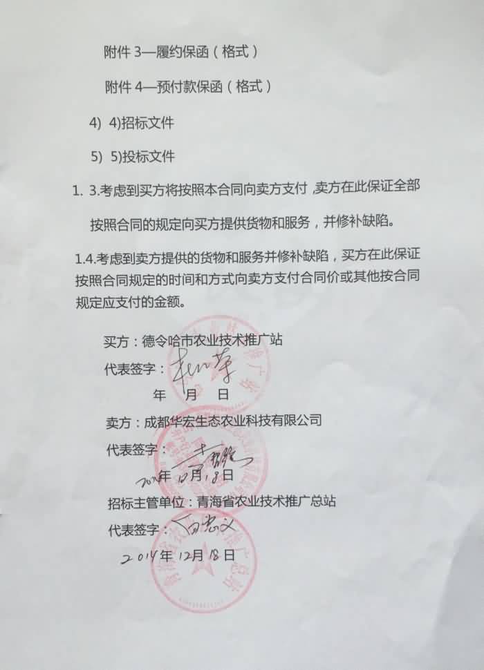 為完成國(guó)家土壤有機(jī)質(zhì)提升項(xiàng)目任務(wù),青海省德令哈市農(nóng)業(yè)技術(shù)推廣站主管并委托青海誠(chéng)德招標(biāo)代理有限公司對(duì)青海省2014年耕地保護(hù)與質(zhì)量提升補(bǔ)助項(xiàng)目進(jìn)行公開招標(biāo),接受了成都華宏生態(tài)農(nóng)業(yè)科技有限公司以總價(jià)60萬元向青海省德令哈市農(nóng)業(yè)技術(shù)推廣站供應(yīng)經(jīng)過多年試驗(yàn)示范的可信度極高的鹽堿土壤調(diào)理劑。