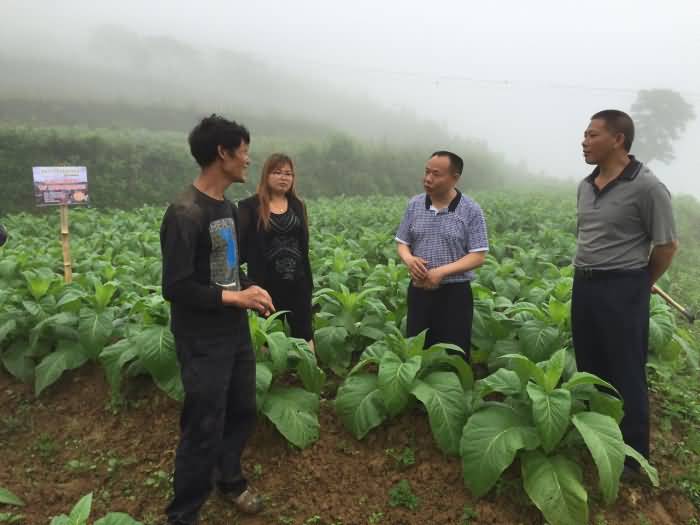 圖4:道真縣河口鄉(xiāng)煙葉管理站韓站長陪同李總到施地佳示范大戶考察使用情況,煙農(nóng)高興地講今年他的煙葉長勢是周邊最好的,高興之情溢于言表