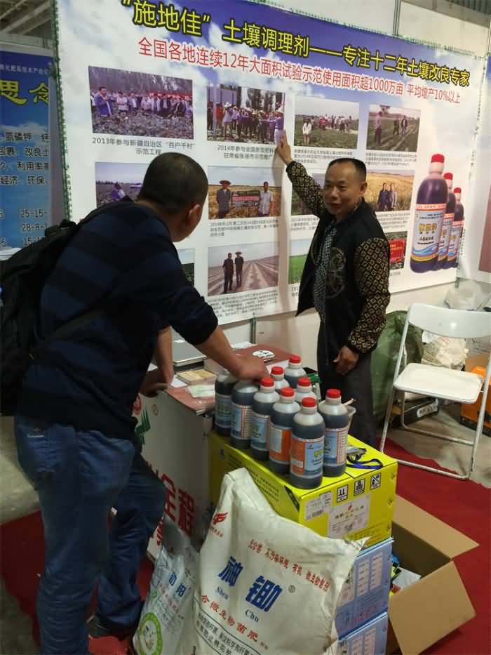 圖為陸副總在向參觀咨詢者解讀“施地佳”土壤調(diào)理劑的調(diào)理原理