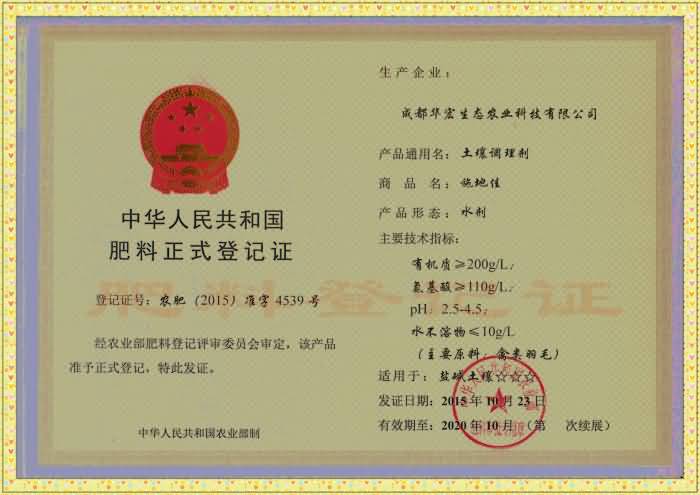 熱烈祝賀我公司“施地佳”土壤調(diào)理劑獲準(zhǔn)農(nóng)業(yè)部正式登記 2015-11-15 華宏生物 熱烈祝賀我公司“施地佳”土壤調(diào)理劑獲準(zhǔn)農(nóng)業(yè)部正式登記