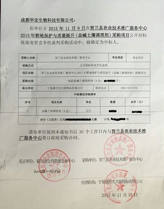 不久前,國(guó)內(nèi)土壤調(diào)理劑產(chǎn)品研發(fā)生產(chǎn)先導(dǎo)型企業(yè)——成都華宏生態(tài)農(nóng)業(yè)科技有限公司,收到了一份特別的通知書,“賀蘭縣政府采購(gòu)”幾個(gè)大字分外顯眼,無(wú)不讓人感覺這份通知書的分量十足。筆者了解到,這是該企業(yè)參與賀蘭縣農(nóng)業(yè)技術(shù)推廣服務(wù)中心“2015年鹽堿土壤調(diào)理劑采購(gòu)項(xiàng)目”投標(biāo)的中標(biāo)通知書,該通知書的取得也意味著成都華宏在同類投標(biāo)中連續(xù)四年中標(biāo),如此傲人的成績(jī)?cè)跇I(yè)內(nèi)還不多見。