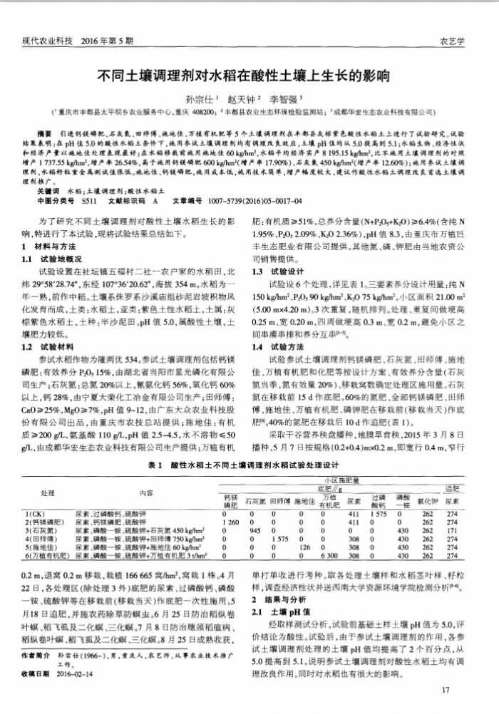 《現(xiàn)代農(nóng)業(yè)科技》2016年 第5期不同土壤調(diào)理劑對水稻在酸性土壤上生長的影響