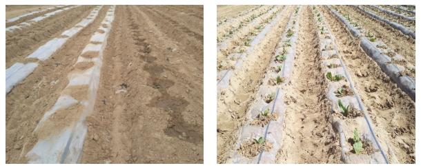 在有列當(dāng)危害嚴(yán)重的煙田規(guī)劃出10畝地進(jìn)行試驗。設(shè)2個處理,處理滴灌施用神鋤生物菌肥,鹽堿土壤調(diào)理劑,噴施氨基酸葉面肥;處理二:只滴灌不施用任何藥劑。