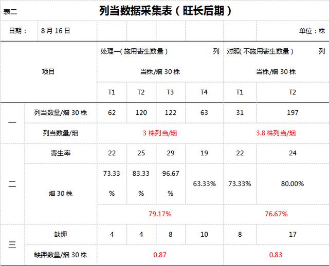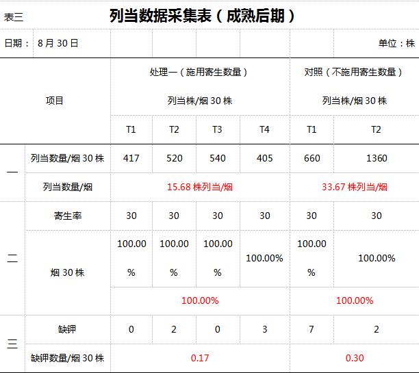從圖12、表二可以看出成熟后期列當(dāng)對煙株的影響差異明顯,煙株萎縮嚴(yán)重,通過數(shù)據(jù)調(diào)查施用煙株寄生數(shù)量、缺鉀株數(shù)明顯少于對照,但這個時期已經(jīng)到了列當(dāng)生長的高峰期,寄生率都是百分之百。
