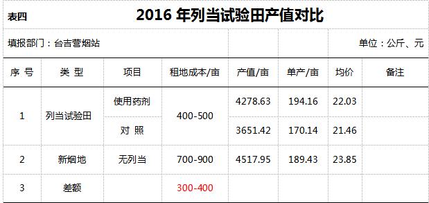 從表四、表五可以看出使用藥劑畝產(chǎn)值高于對照627.21元,單產(chǎn)也高于對照24.02kg,而使用藥劑跟臺吉營片區(qū)平均產(chǎn)值4517.95元對比,也只相差239.32元,每畝藥劑成本348.00,租地成本加藥劑成本與無列當(dāng)煙地租金接近,所以不使用藥劑的煙田列當(dāng)對產(chǎn)值影響超過20%,而施用藥劑的對其影響降到了5%。