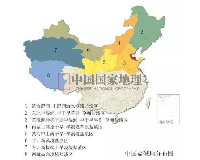 2 地理條件:地形部位高低對鹽堿土的形成影響很大,地形高低直接影響地表水和地下水的運動,也就與鹽分的移動和積聚有密切關(guān)系,從大地形看,水溶性鹽隨水從高處向低處移動,在低洼地帶積聚。鹽堿土主要分布在內(nèi)陸盆地、山間洼地和平坦排水不暢的平原區(qū),如松遼平原。從小地形(局部范圍內(nèi))來看,土壤積鹽情況與大地形正相反,鹽分往往積聚在局部的小凸處。我國鹽堿地分布圖如下圖示。