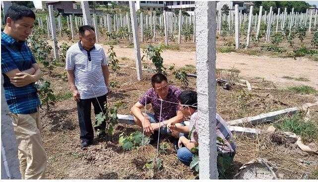 17日中午,參觀考察的一行人又趕到成都華宏生物公司的葡萄園示范基地園。這是于2016年在新津縣文井鄉(xiāng)華泉家庭農(nóng)場(chǎng)建立起來(lái)的葡萄示范基地園,集合了當(dāng)下先進(jìn)的葡萄園種植技術(shù),有效提升了葡萄的產(chǎn)量。陳總一行人在葡萄園里仔細(xì)察看了全園的葡萄長(zhǎng)勢(shì),并咨詢了華泉家庭農(nóng)場(chǎng)場(chǎng)長(zhǎng)姚志均有關(guān)葡萄這幾年的種植過(guò)程。該葡萄園示范基地全程采用成都華宏生物公司的水肥一體化技術(shù)富硒葡萄綜合方案,有效改善了過(guò)去果農(nóng)收成不高的狀況,幫助果農(nóng)成功獲得了高收益。