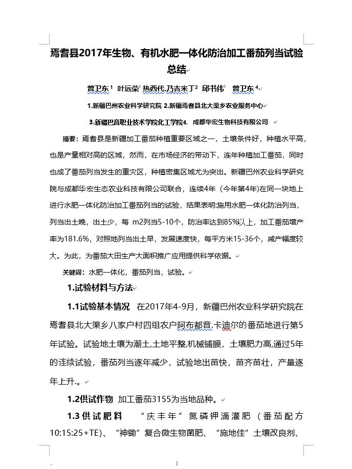 焉耆縣2017年生物、有機(jī)水肥一體化防治加工番茄列當(dāng)試驗(yàn)總結(jié)
