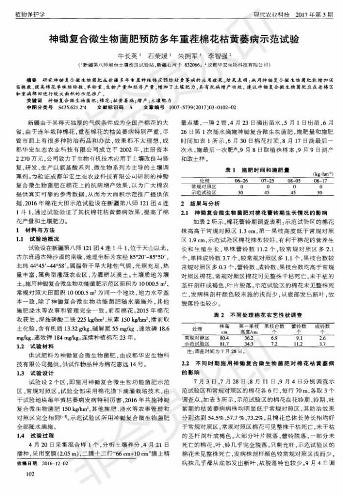 神鋤復(fù)合微 生物菌肥預(yù)防多年重茬棉花枯黃萎病 示范試驗(yàn)